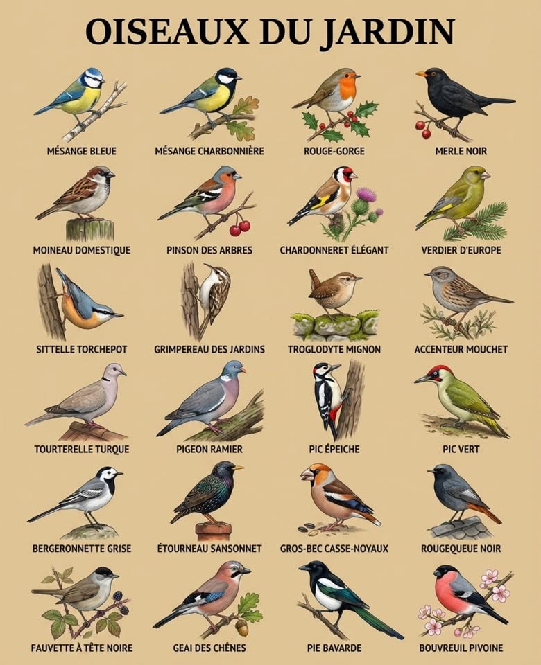 le verdier, la sitelle, le troglodyte, la tourterelle, le pic vert, la bergeronnette, l’étourneau, la fauvette, le geai, le bouvreuil et la pie.